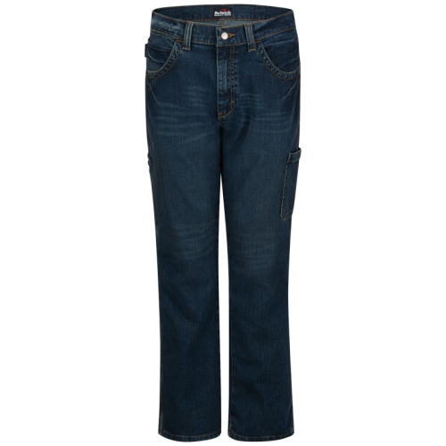 12oz., FR 94% cotton, 5% polyester, 1% spandex Elastane. One-piece waistband with metal button closure. Utility pocket on left leg, additional ruler pocket on right leg and utility loop on left hip. NFPA 2112